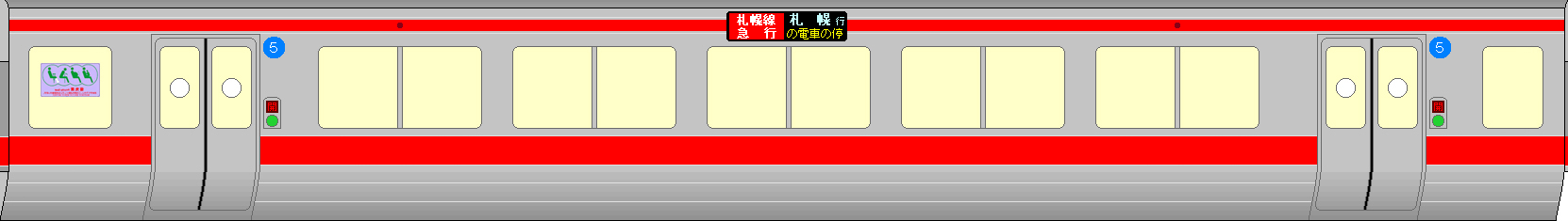 | 車内設備 | トイレ(1号車の札幌寄り・4号車の札幌寄り・7号車の函館寄り) 車椅子・ベビーカースペース(1号車〜6号車の札幌寄り・7号車の函館寄り) LCD車内案内板(全てのドアの上部に設置) 大型フルカラー行先表示機(前面・側面ともに) 優先席(2〜6号車) 各車両に防犯カメラあり。 各車両に空気清浄機を設置。 客室内は最新のLED照明。 各車両にSOSボタン設置(車掌への緊急連絡用/押すと電車が止まります) 各車両に乗務員呼び出しボタン設置(車掌への簡易連絡用/押しても電車は止まりません) ※急を要さない場合は、SOSボタンは使用禁止 です(すぐに対応できない場合があります) 各駅到着前に自動放送で駅ナンバーを放送するようにしました。 ディスプレイ式広告表示装置 全座席にコンセントを設置(携帯電話・スマートフォン・携帯ゲーム機などの充電) 全ての座席にUSB電源を設置。 グリーン車にWi-Fi設備を設置。 座席間にディバイダを設置して、座席間のプライベートをお守りします! ※横からのスマホなどののぞき見防止など。 |