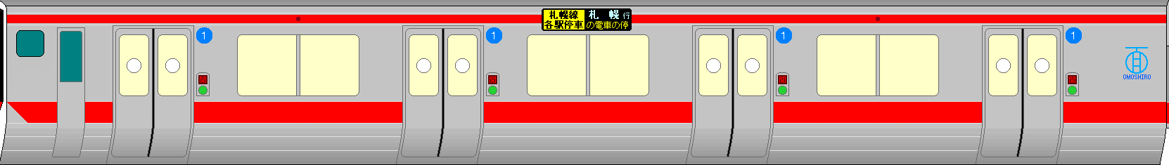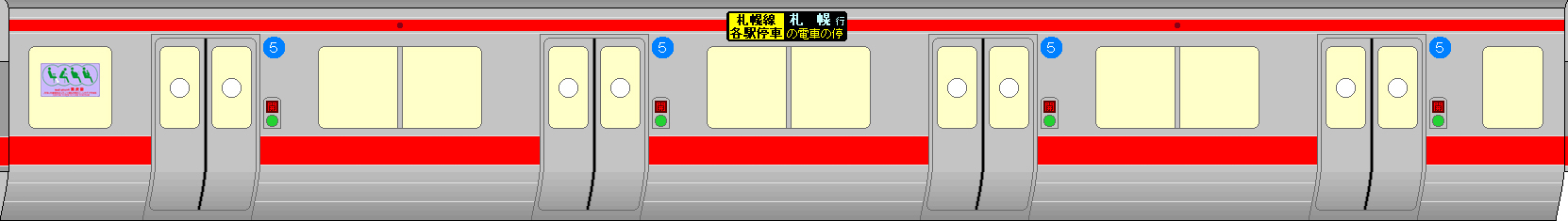| 車内設備 | トイレ(1号車の札幌寄り・4号車の札幌寄り・7号車の小樽寄り) 車椅子・ベビーカースペース(1号車〜6号車の札幌寄り・7号車の小樽寄り) LCD車内案内板(全てのドアの上部に設置) 大型フルカラー行先表示機(前面・側面ともに) 優先席(2〜6号車) 各車両に防犯カメラあり。 各車両に空気清浄機を設置。 客室内は最新のLED照明。 各車両にSOSボタン設置(車掌への緊急連絡用/押すと電車が止まります) 各車両に乗務員呼び出しボタン設置(車掌への簡易連絡用/押しても電車は止まりません) ※急を要さない場合は、SOSボタンは使用禁止 です(すぐに対応できない場合があります) 各駅到着前に自動放送で駅ナンバーを放送するようにしました。 ディスプレイ式広告表示装置 全座席にコンセントを設置(携帯電話・スマートフォン・携帯ゲーム機などの充電) 全ての座席にUSB電源を設置。 グリーン車にWi-Fi設備を設置。 座席間にディバイダを設置して、座席間のプライベートをお守りします! ※横からのスマホなどののぞき見防止など。 |