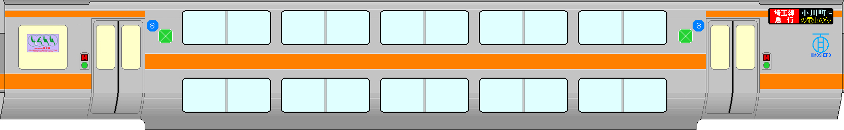 | 車内設備 | トイレ(1号車の池袋寄り・8号車の池袋寄り・15号車の小川町寄り) 車椅子・ベビーカースペース(1号車〜14号車の池袋寄り・15号車の小川町寄り) LCD車内案内板(全てのドアの上部に設置) 大型フルカラー行先表示機(前面・側面ともに) 優先席(2〜14号車) 各車両に防犯カメラあり。 各車両に空気清浄機を設置。 客室内は最新のLED照明。 各車両にSOSボタン設置(車掌への緊急連絡用/押すと電車が止まります) 各車両に乗務員呼び出しボタン設置(車掌への簡易連絡用/押しても電車は止まりません) ※急を要さない場合は、SOSボタンは使用禁止 です(すぐに対応できない場合があります) 各駅到着前に自動放送で駅ナンバーを放送するようにしました。 ディスプレイ式広告表示装置 全座席にコンセントを設置(携帯電話・スマートフォン・携帯ゲーム機などの充電) 全ての座席にUSB電源を設置。 グリーン車にWi-Fi設備を設置。 座席間にディバイダを設置して、座席間のプライベートをお守りします! ※横からのスマホなどののぞき見防止など。 |