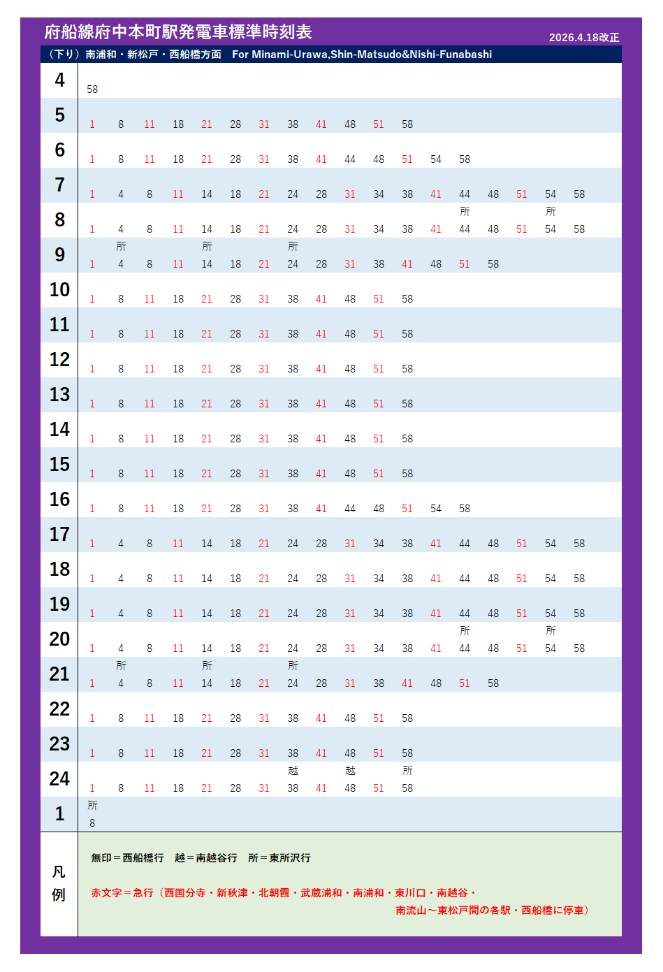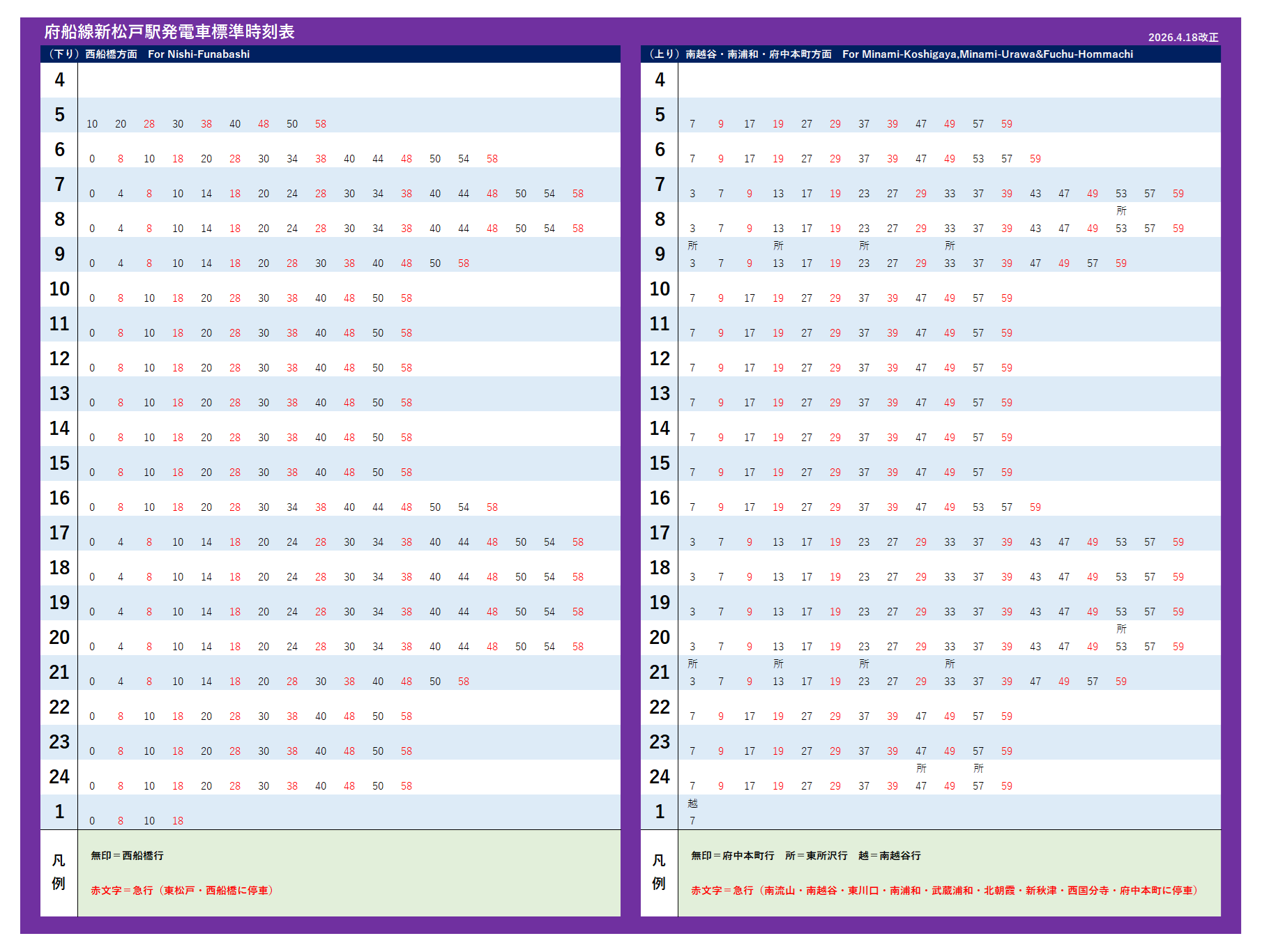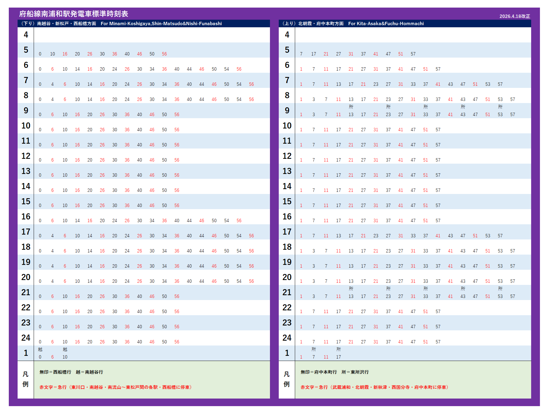| 府中本町駅 | 南浦和駅 | 新松戸駅 | 西船橋駅 | - | - | |
