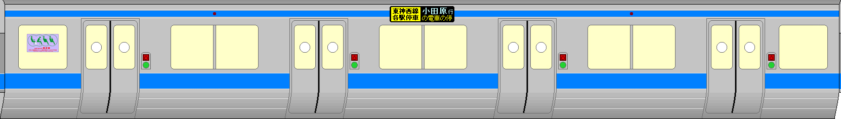 | 車内設備 | トイレ(1号車の新松田寄り・7号車の小田原寄り) 車椅子・ベビーカースペース(1号車の新松田寄り・4号車の新松田寄り・7号車の小田原寄り) 飲み物の自動販売機(4号車の新松田寄り) LCD車内案内板(全てのドアの上部に設置) 大型フルカラー行先表示機(前面・側面ともに) 優先席(2・3・4・5・6号車) 各車両に防犯カメラあり。 客室内は最新のLED照明。 各車両にSOSボタン設置(車掌への緊急連絡用/押すと電車が止まります) 各車両に乗務員呼び出しボタン設置(車掌への簡易連絡用/押しても電車は止まりません) ※急を要さない場合は、SOSボタンは使用禁止 です(すぐに対応できない場合があります) 各駅到着前に自動放送で駅ナンバーを放送するようにしました。 ディスプレイ式広告表示装置 窓側の壁(座席)にコンセントを設置(携帯電話・スマートフォン・携帯ゲーム機などの充電) 各車両に空気清浄機を設置。 |