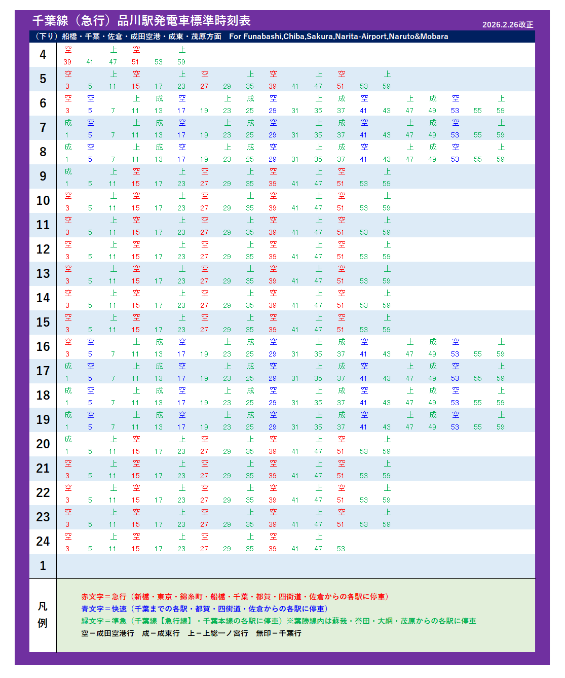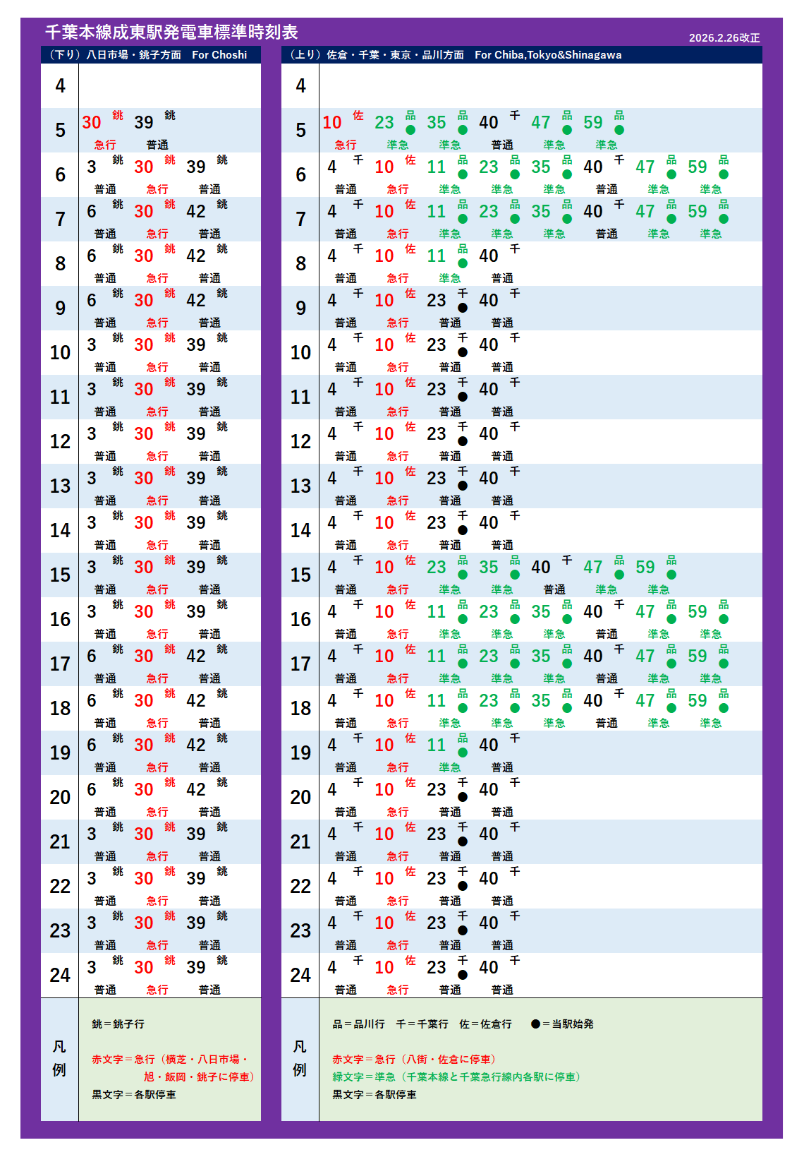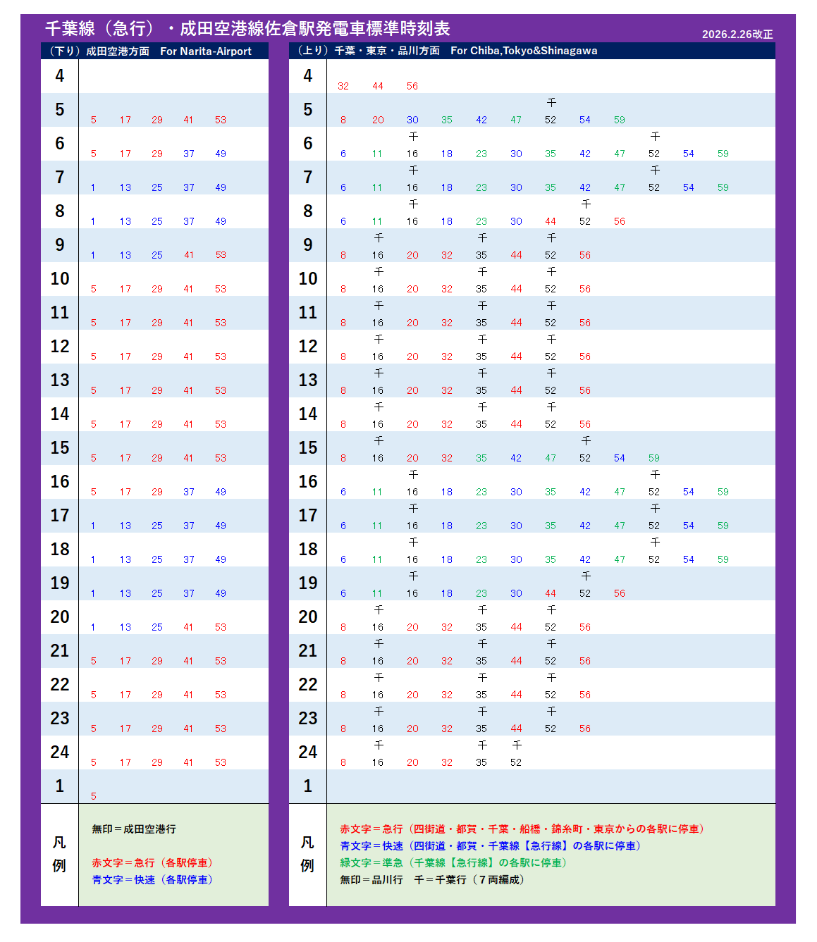 | 千葉(急行)・成田空港・千葉本線(2026年2月26日改正) | |||||||