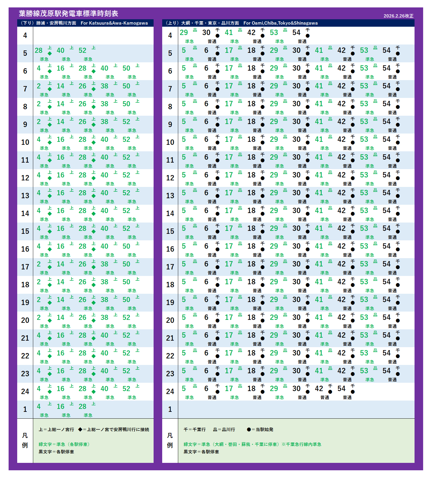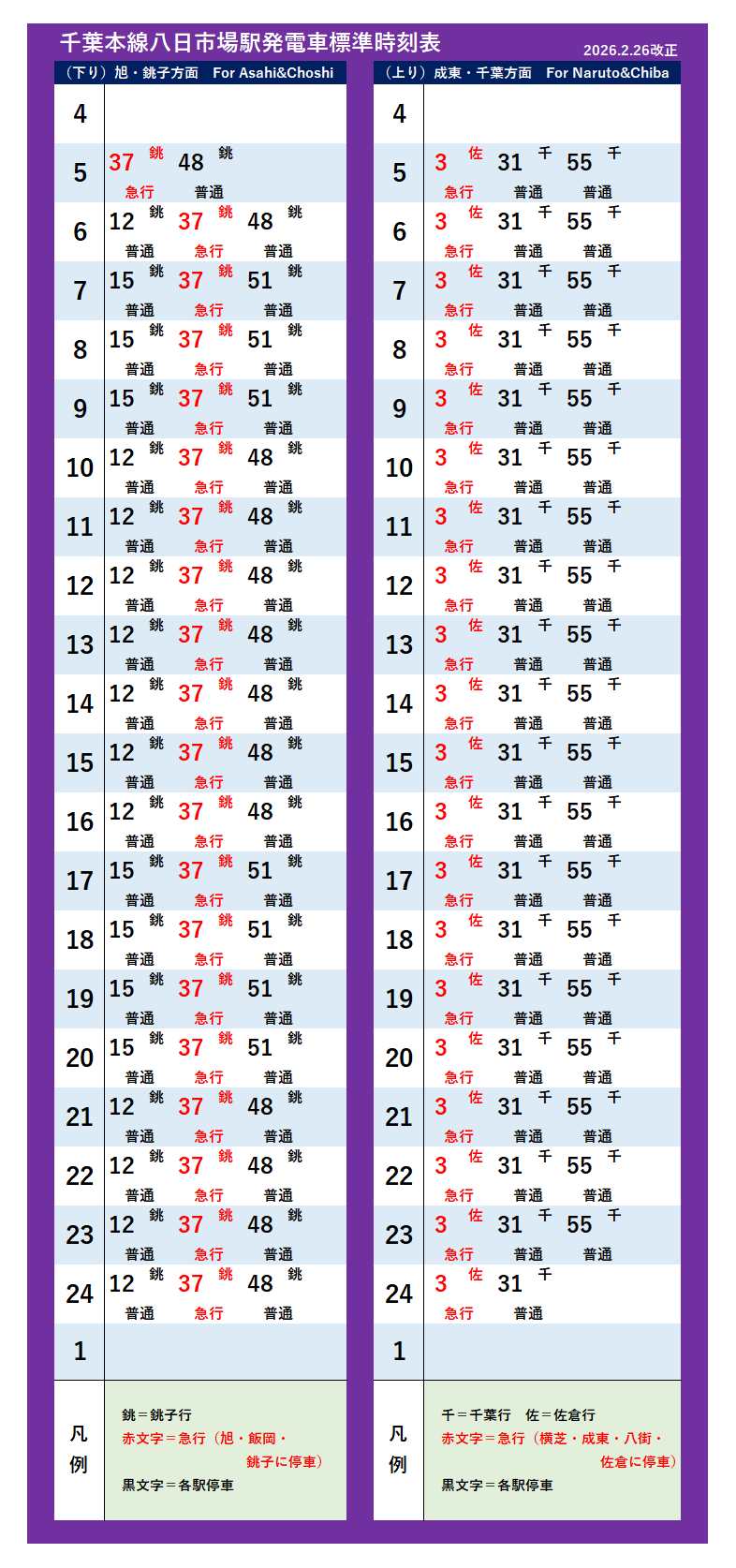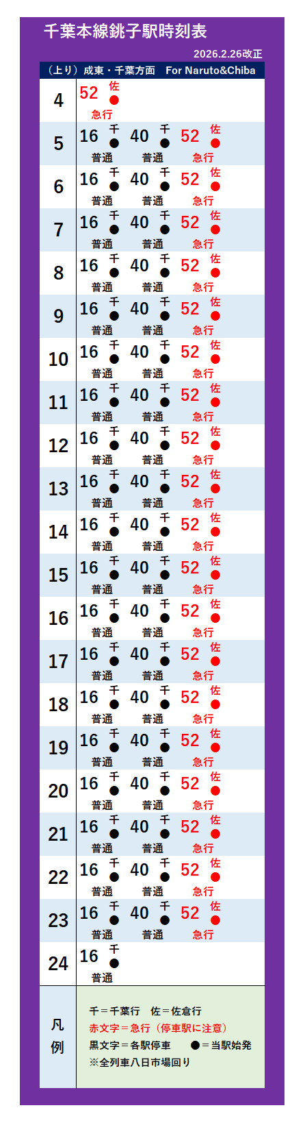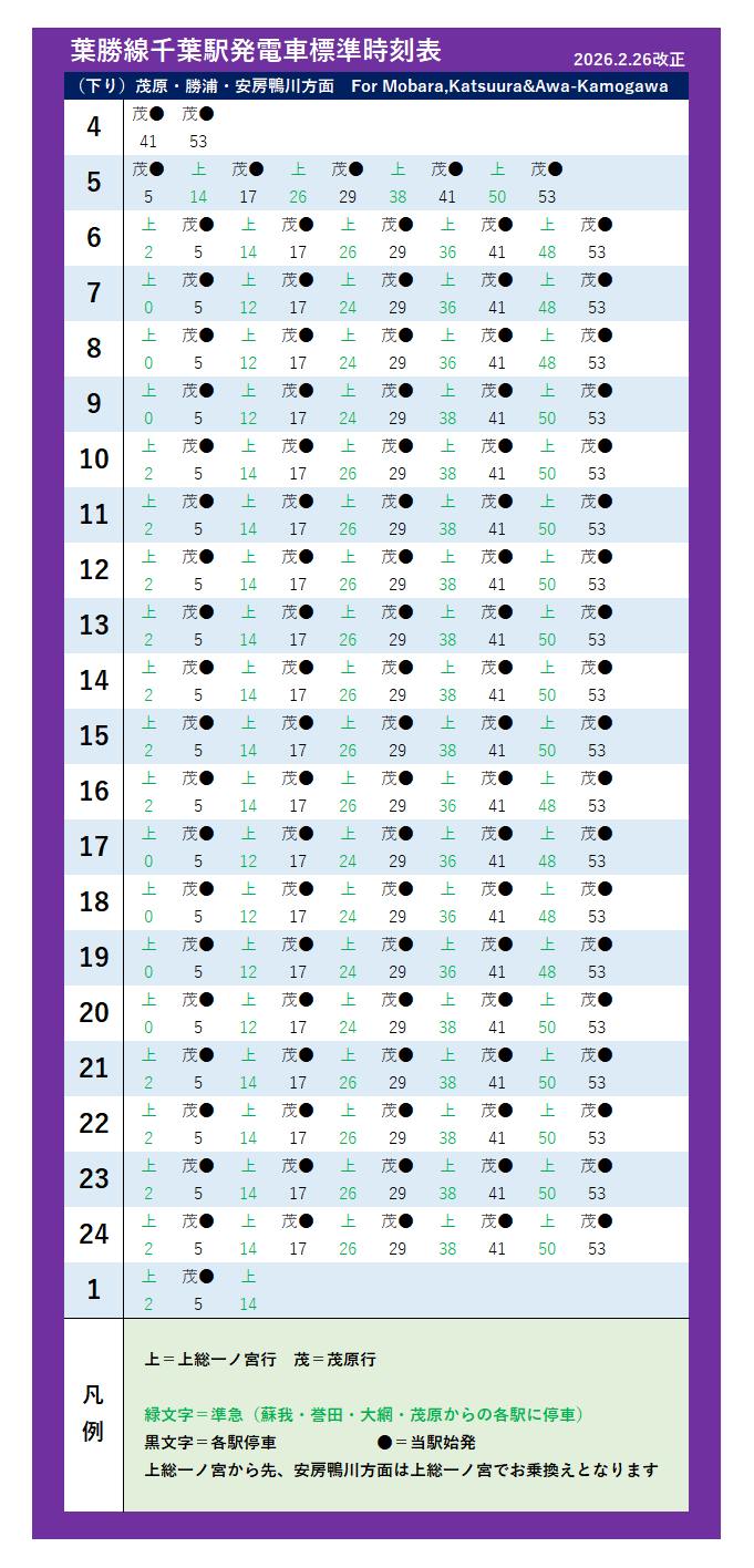 | 千葉(急行)・成田空港・千葉本線(2026年2月26日改正) | |||||||