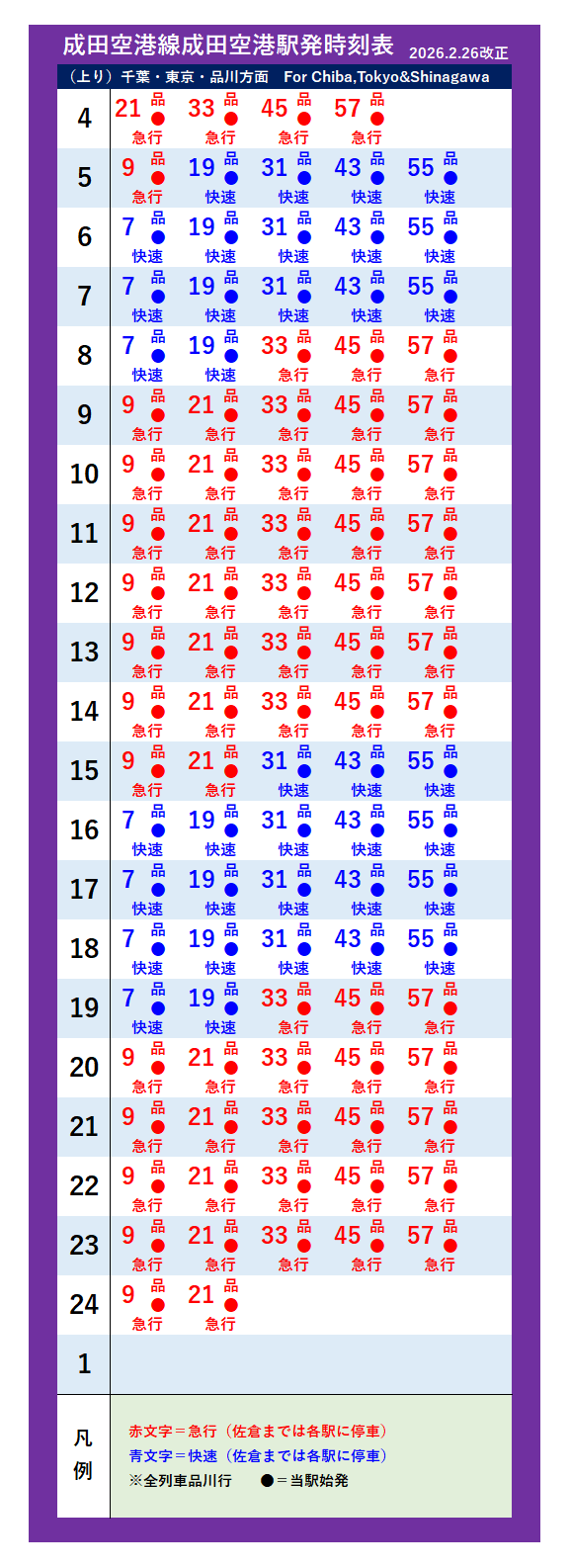 | 品川駅 | 船橋駅 | 千葉駅 | 佐倉駅 | 成田空港駅 | - | ||