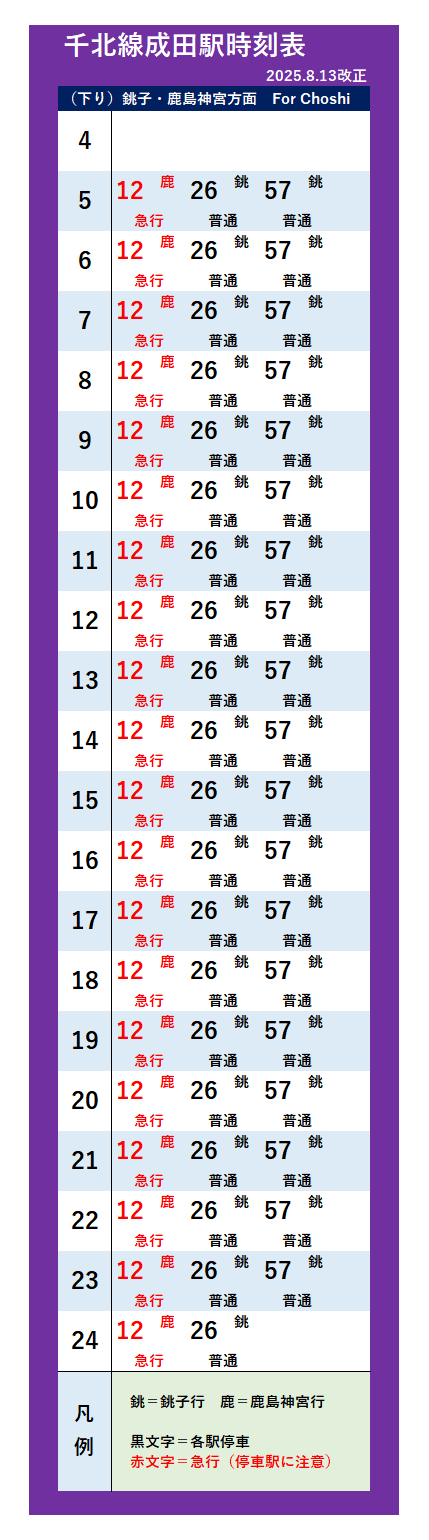 | 成田駅 | 佐原駅 | 銚子駅 | 鹿島神宮駅 | - | - | ||