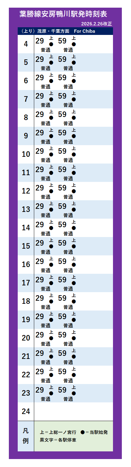 | 千葉駅 | 茂原駅 | 上総一ノ宮駅 | 勝浦駅 | 安房鴨川駅 | - | ||